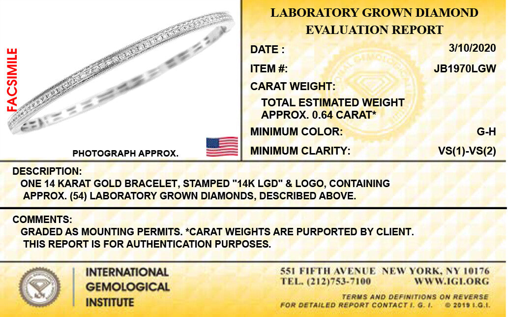 14K White Gold Lab Grown Diamond 5/8 Ct Bangle Bracelet with IGI Certificate