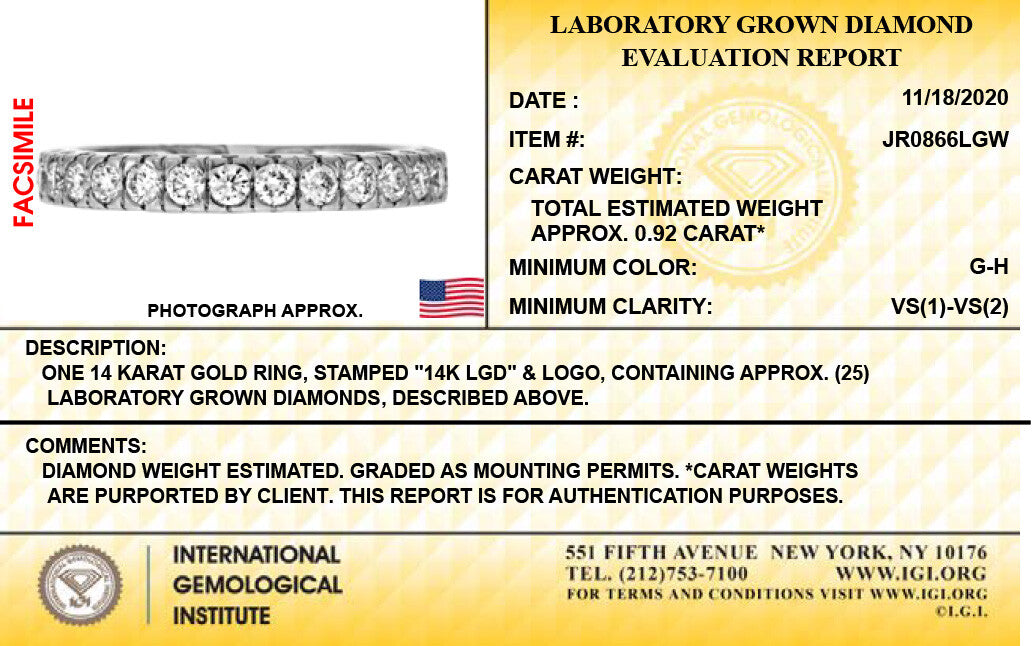 14K White Gold Lab Grown Diamond 7/8 Ct Eternity Band Ring. Size 7, IGI Certificate