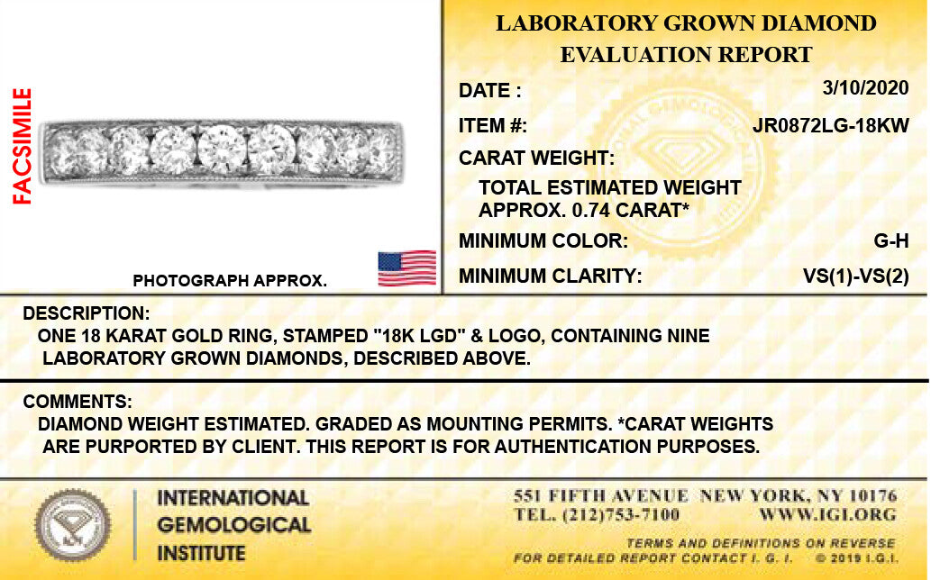 18K White Gold Lab Grown Diamond 3/4 Ct Band Ring. Size 7 with IGI Certificate