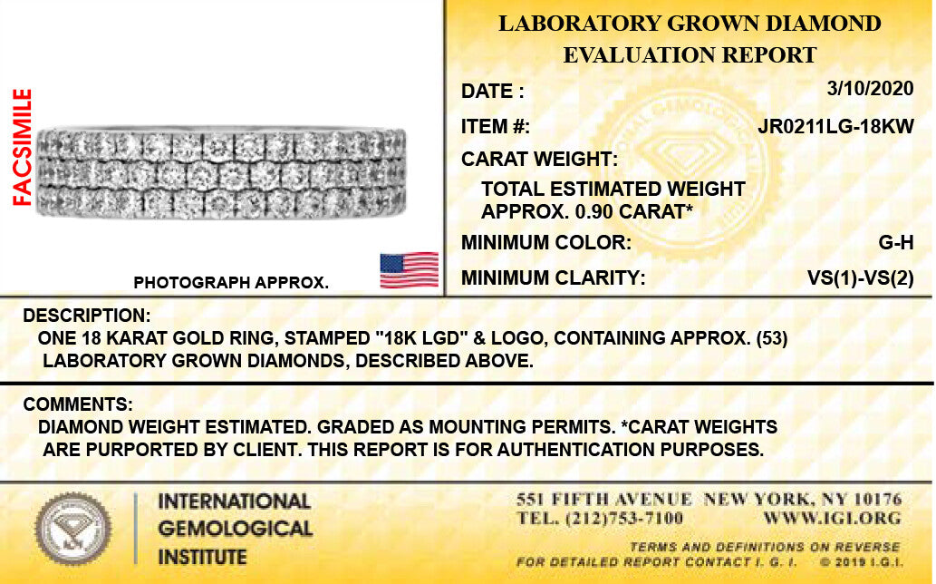 18K White Gold Lab Grown Diamond 7/8Ct Band Ring. Size 7 with IGI Certificate