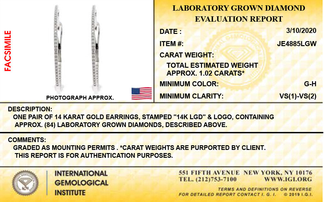 14K White Gold Lab Grown Diamond 1.02 Ct Hoop Earrings, 2 cm Diameter with IGI Certificate